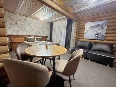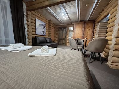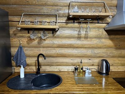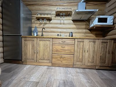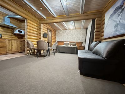 Реальность соответствует описанию. В апартаментах было чисто, посуды, техники, всё как дома. расположение тоже удобное, до всех мест в долине недалеко. особенно впечатляет бревенчатые стены, сам дом, аромат леса)